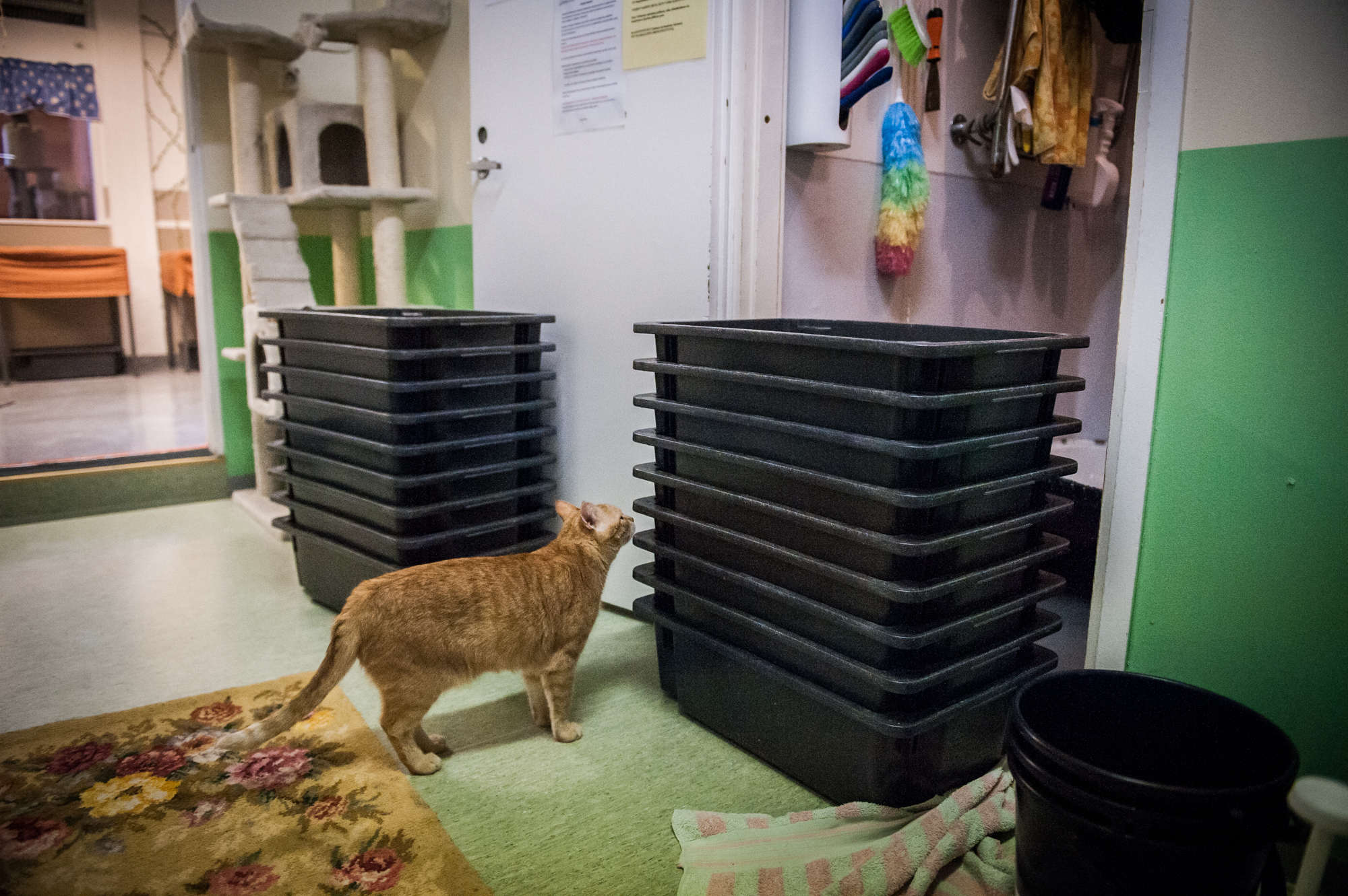 Ruoka- ja vesiastiat on juuri kerätty tiskiin. Kymmenien kuppien jokapäiväinen pesu on alkanut. Inga on syventynyt hiekkalaatikoiden maailmaan. Yleisellä puolella on lähes 30 hiekka-astiaa, jotka seulotaan päivittäin. Laatikot pestään joka toinen päivä. Hiekka vaihdettaan, jos se menee kovin mujuiseksi, muutoin ainoastaan lisäillään. Yksittäisissä huoneissa hiekka vaihtuu aina kun huoneen asukkaat vaihtuu. Kuukaudessa hiekkaa kuluu n. 400 kiloa. Hankimme sitä 1000 kilon lavoina. Hiekan pitää olla mahdollisimman vähän pölyävää sekä kissojen että työntekijöiden vuoksi. Savipölyä ei ole kiva hengittää päivästä toiseen.