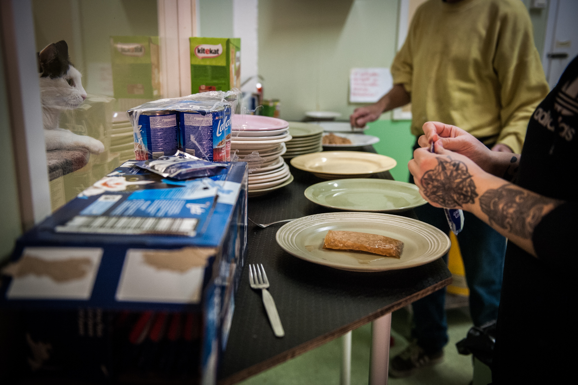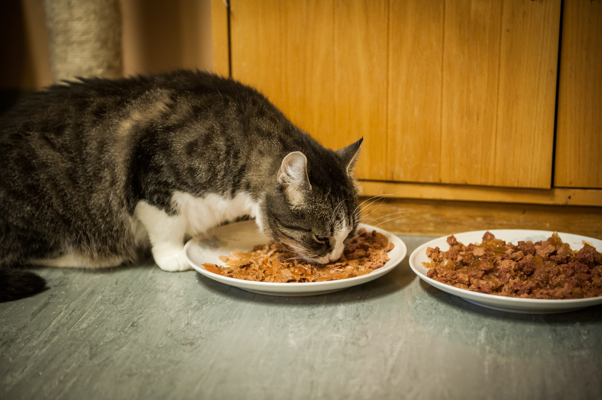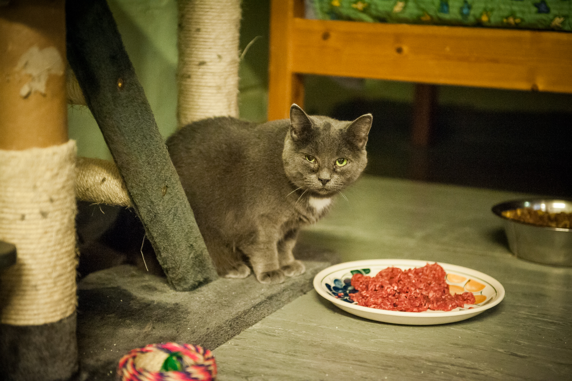 Raksut ovat pääsääntöisesti eläinkaupan tavaraa. Osalla kissoista on sen verran herkkä vatsa, ettei se kestä markettiraksuja. Märkäruokaa on laidasta laitaan. Niin marketti- kuin eläinkaupan tavaraa. Viikoittain kissat saavat myös aitoa lihaa joko suikaleina tai jauhettuna. Tänään tarjolla on niin Latzia, Kitekattia kuin Applawsia. Jaetaan myös muutama lautanen jauhelihaa. Menu riippuu siitä mitä on lahjoitettu. Sen lisäksi myös ostetaan ruokia tarpeen mukaan. Toisinaan joku kissa tarvitsee erikoisruokavalion esim. munuaisongelmien takia. Sekin pyritään järjestämään. Tänäänkin kissat hyökkäävät ensiksi jauhelihan ja Latz-pussiruoan kimppuun. Purkkiruoasta ei tykätä niin paljon, joten se jää vielä lautaselle. Myöhemmin illalla arimmat kissat tulevat ilmastointiputkien päältä. Ne uskaltautuvat syömään vasta kun talo on hiljentynyt.
