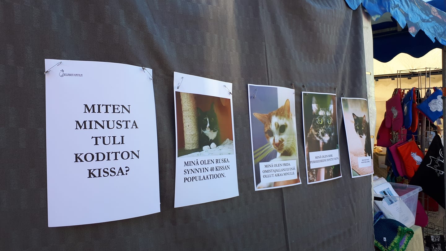 Viime viikonloppuna osallistuimme perinteiseen tapaan Elomessuille. Iso telttakatos oli jälleen koottu, kannatustuotteet laitettu myyntipöytään ja vapaaehtoiset kertomassa Kattilan tuiki tärkeästä toiminnasta. Erityisesti ihmisiä pysäytti ja tuntui vetävän puoleensa teltan ulkosivulla olleet kuvat, kera kysymyksen ”Miten minusta tuli koditon kissa?”.